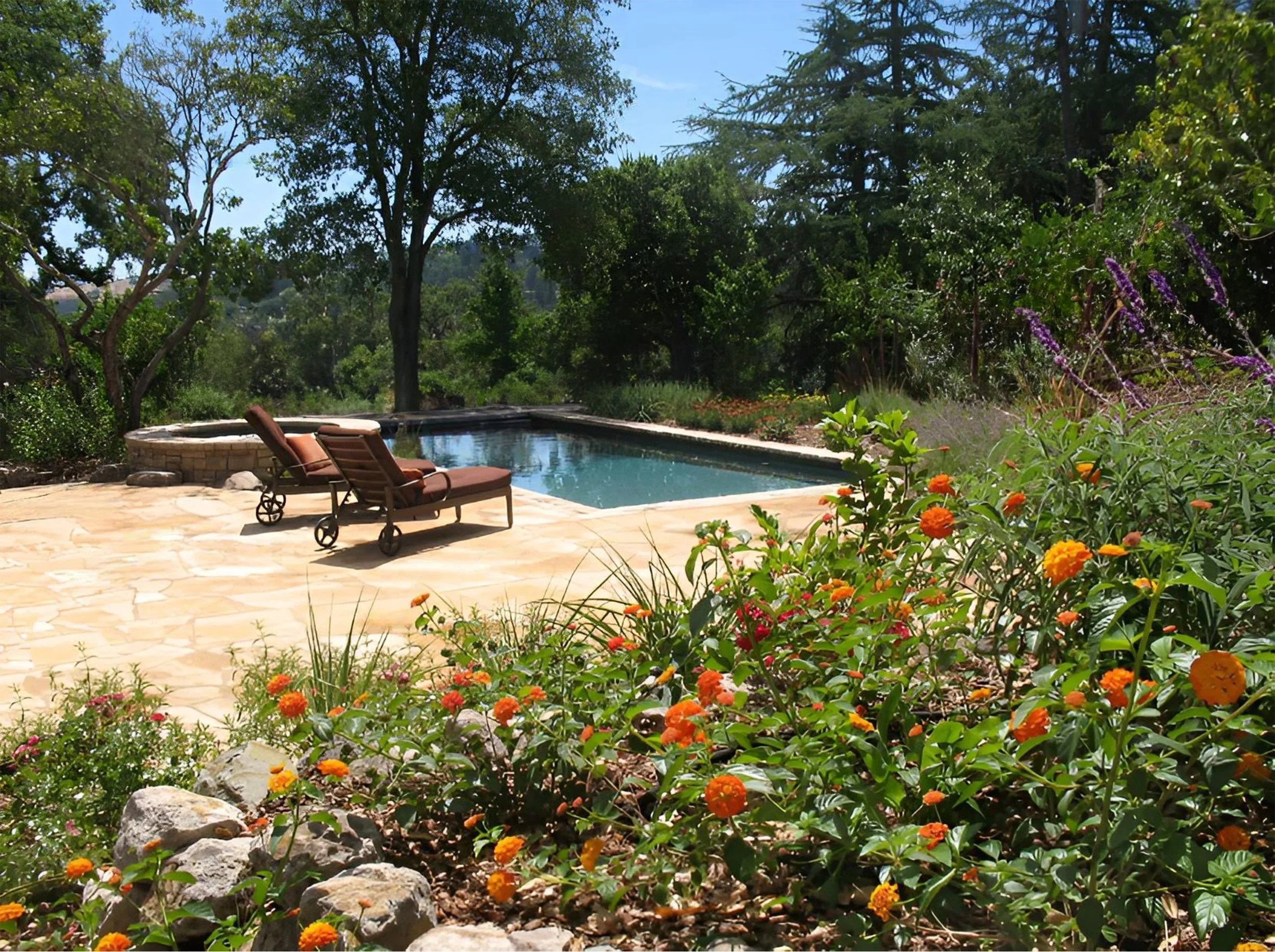 Where appropriate, custom pool and spa design can be incorporated into the overall landscape plan. On larger parcels, pools are positioned strategically to anchor the design while preserving openness and flexibility.